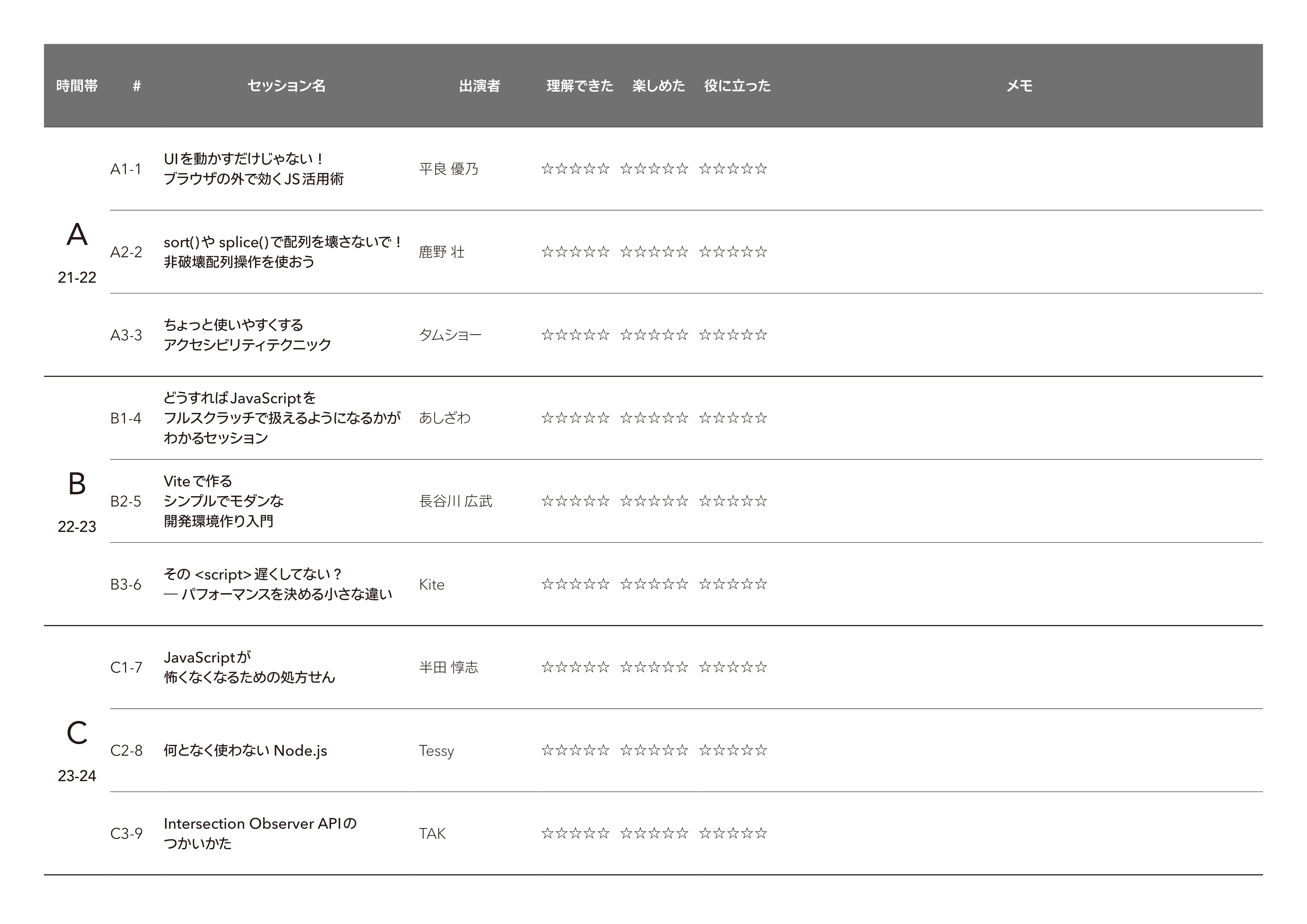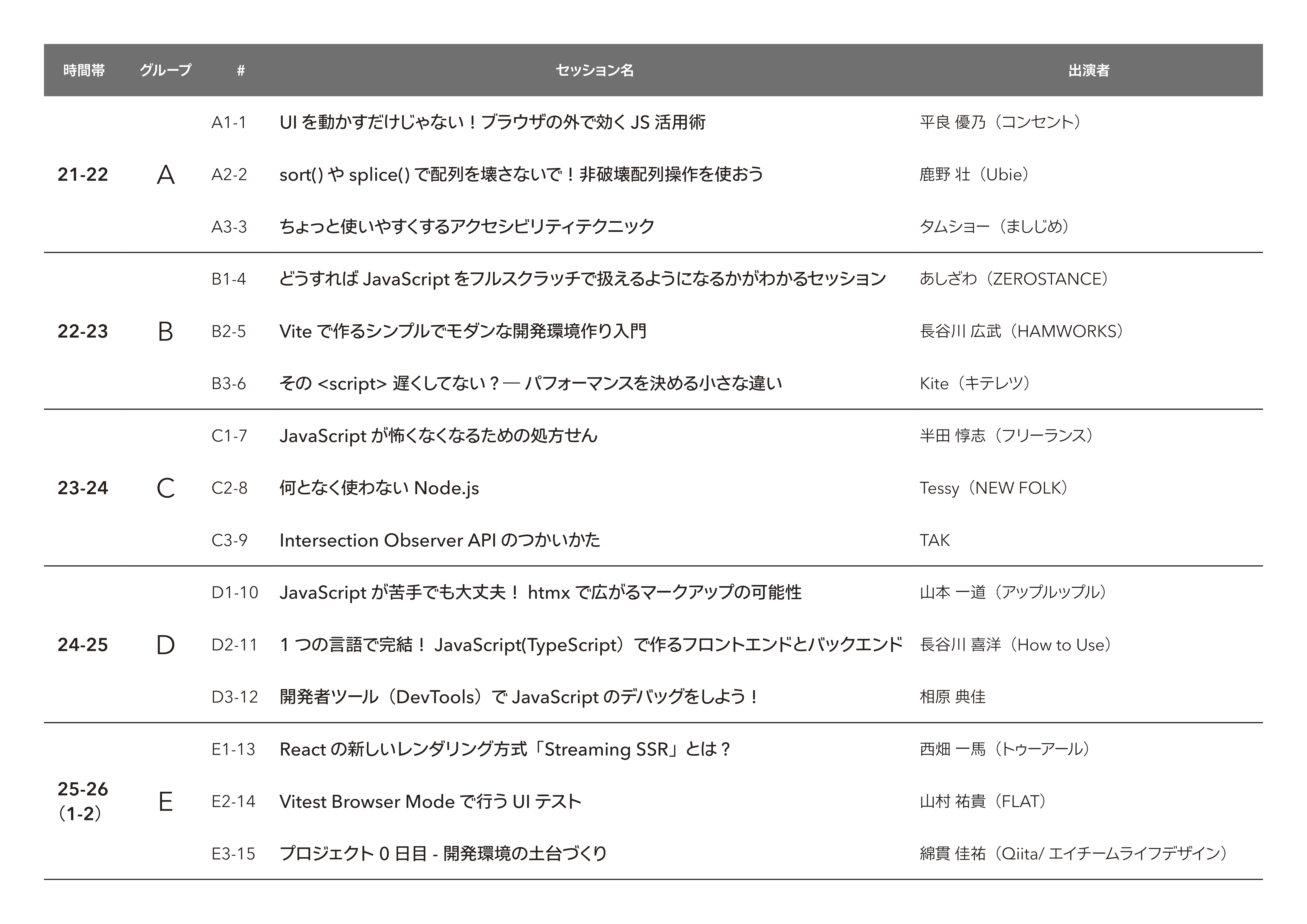 | 22-23 | B1-4 | どうすればJavaScriptをフルスクラッチで扱えるようになるかがわかるセッション | あしざわ(ZEROSTANCE) |
