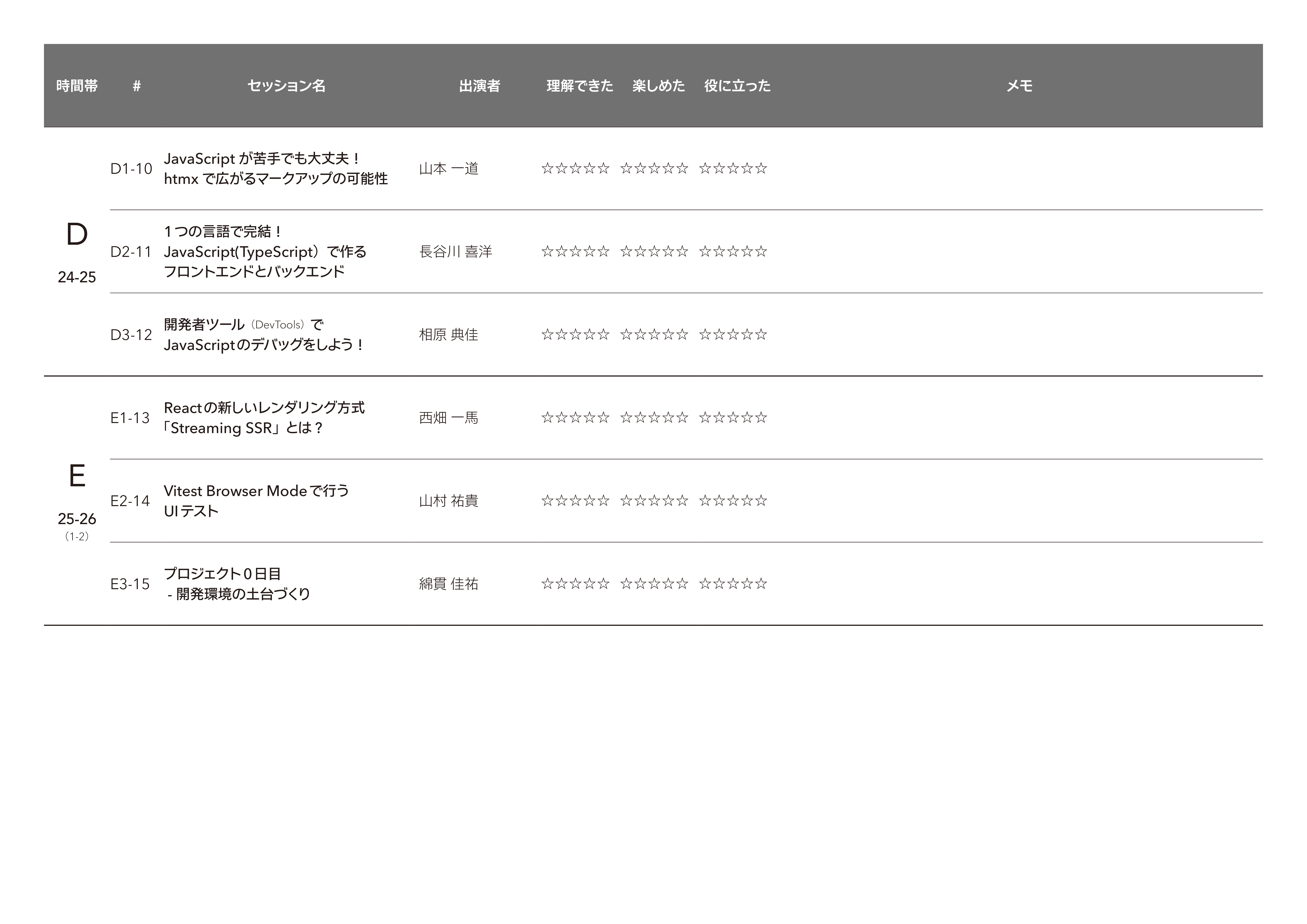 | 25-26 | E1-13 | Reactの新しいレンダリング方式「Streaming SSR」とは? | 西畑 一馬(トゥーアール) |